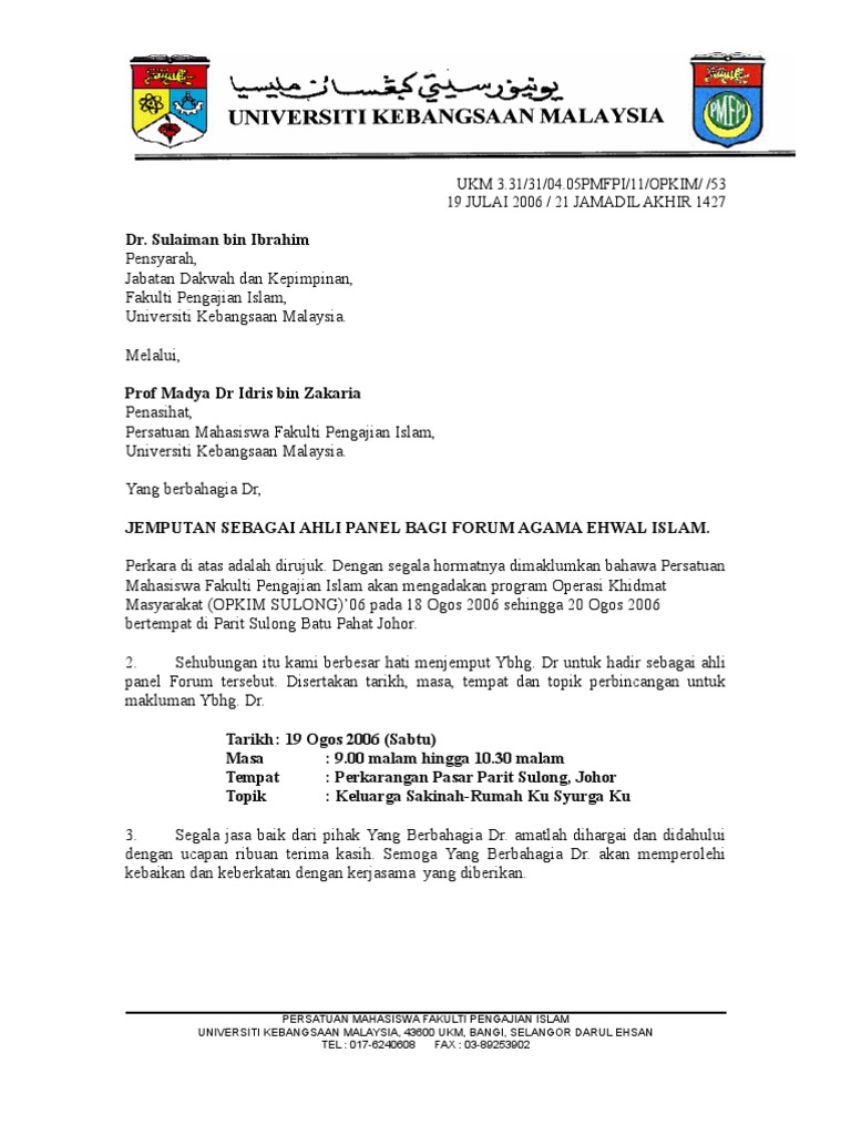 Tuan, jemputan ke majlis perasmian kem jana 5a upsr 2013, sk kuala dura dengan hormat dan sukacitanya perkara di atas dirujuk. Bagaimana untuk menulis surat jemputan penceramah secara rasmi? Noor) tuan, majlis pelancaran program jom ke sekolah merujuk perkara di atas, pihak sekolah kebangsaan pulau manis dengan segala hormatnya menjemput tuan ke majlis yang akan di adakan seperti. Format surat jemputan sangat penting sebagai tanda penghormatan kepada seseorang. Pejabat pendidikan daerah batang padangjalan pahang,35ooo tapah 3.